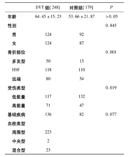 通过 427 例患者基础数据发现,创伤性骨折血栓的高危风险包括了基础疾病,高能量创伤,多发性骨折等,同时可以观察到所形成的血栓绝大部分是周围型血栓,这类血栓没有明显的下肢血栓典型症状如小腿周长,肿胀等,导致其极易被忽视,同时该类血栓更多处于活动期,非常容易脱落,导致PE 的发生。